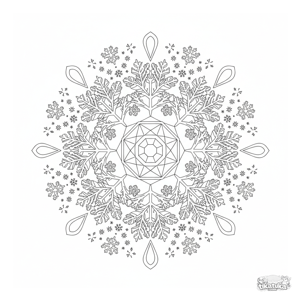 Very detailed snowflake-shaped mandala coloring page for ages 10-12. Six-fold symmetry, intricate crystal patterns, ice drops, and tiny scattered crystals around the edges.