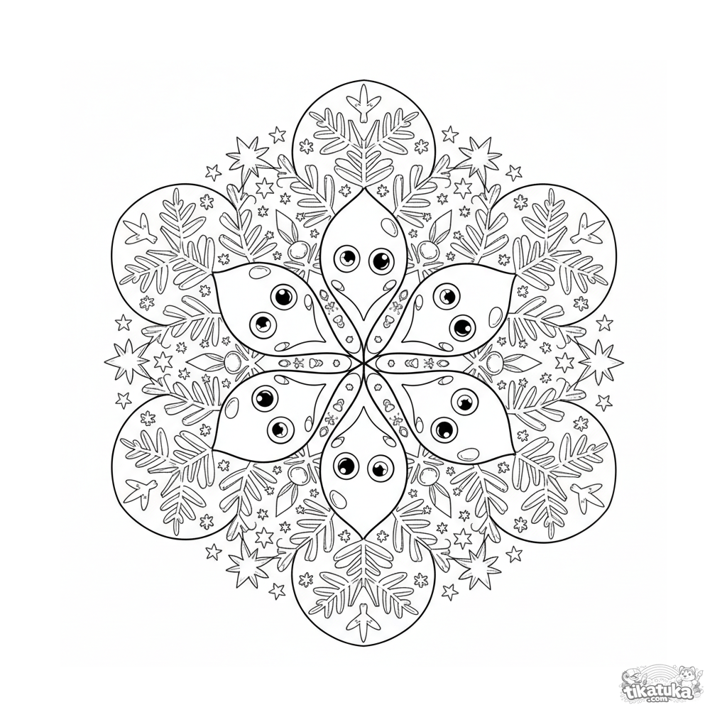 Intricate snowflake mandala coloring page for ages 10-12. Six lacy branches with ice crystals, droplets, and tiny stars, perfect six-fold symmetry.