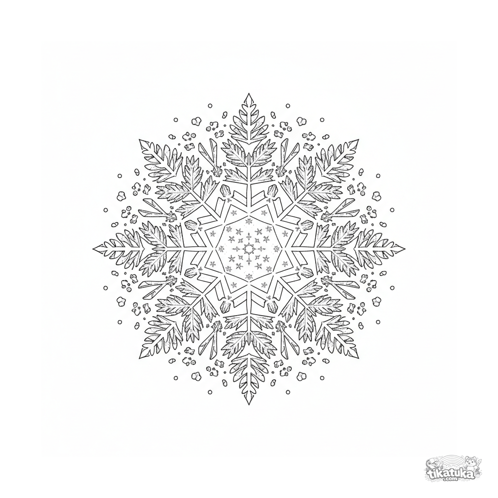 Exquisite snowflake-shaped mandala with six-fold symmetry. A highly detailed coloring page with ice crystals for ages 10-12.