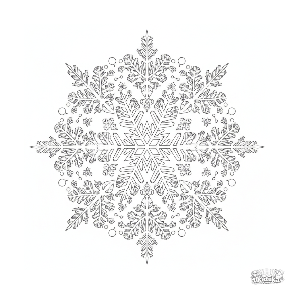 Intricate snowflake mandala with six-fold symmetry coloring page for ages 10-12. Ice crystal branches, feathery patterns, fine engraving-style details.