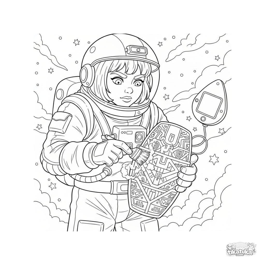 Detailed coloring page for ages 10-12: a space archaeologist in outer space examines an ancient alien artifact with a brush and scanner.
