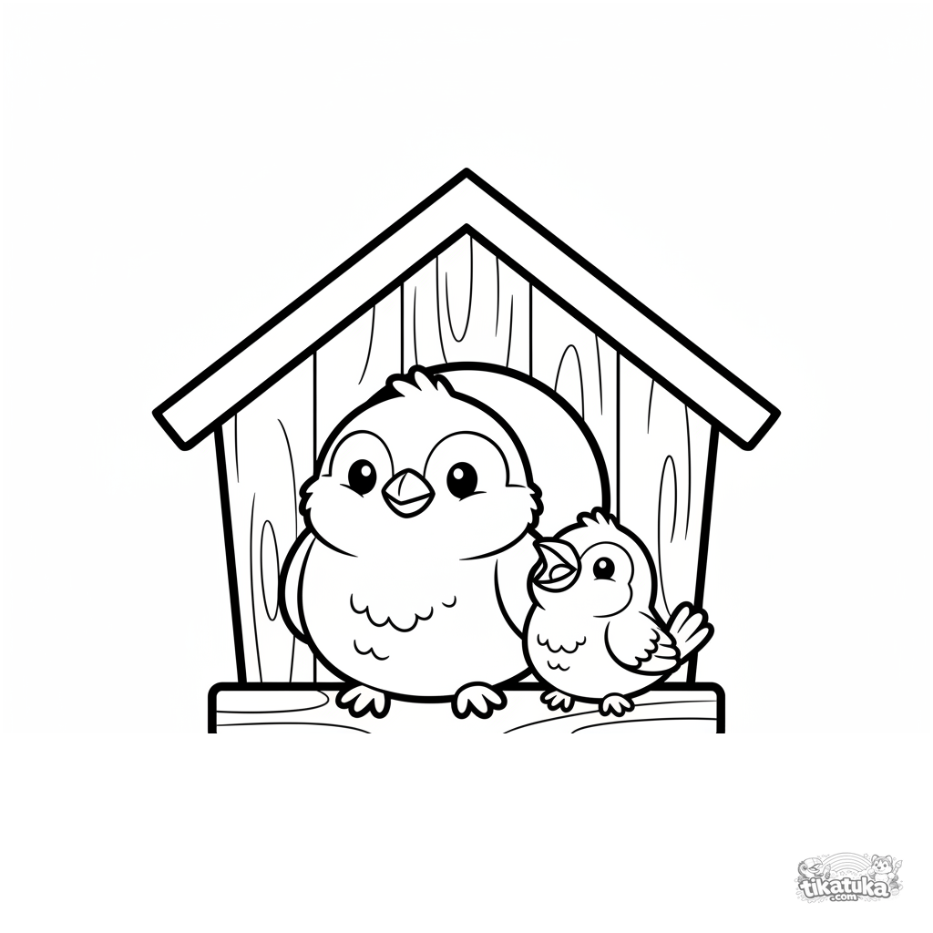Toddler coloring page for ages 2-3: a sparrow with a chick in a cozy wooden birdhouse. Simple large shapes and wide margins for easy coloring.