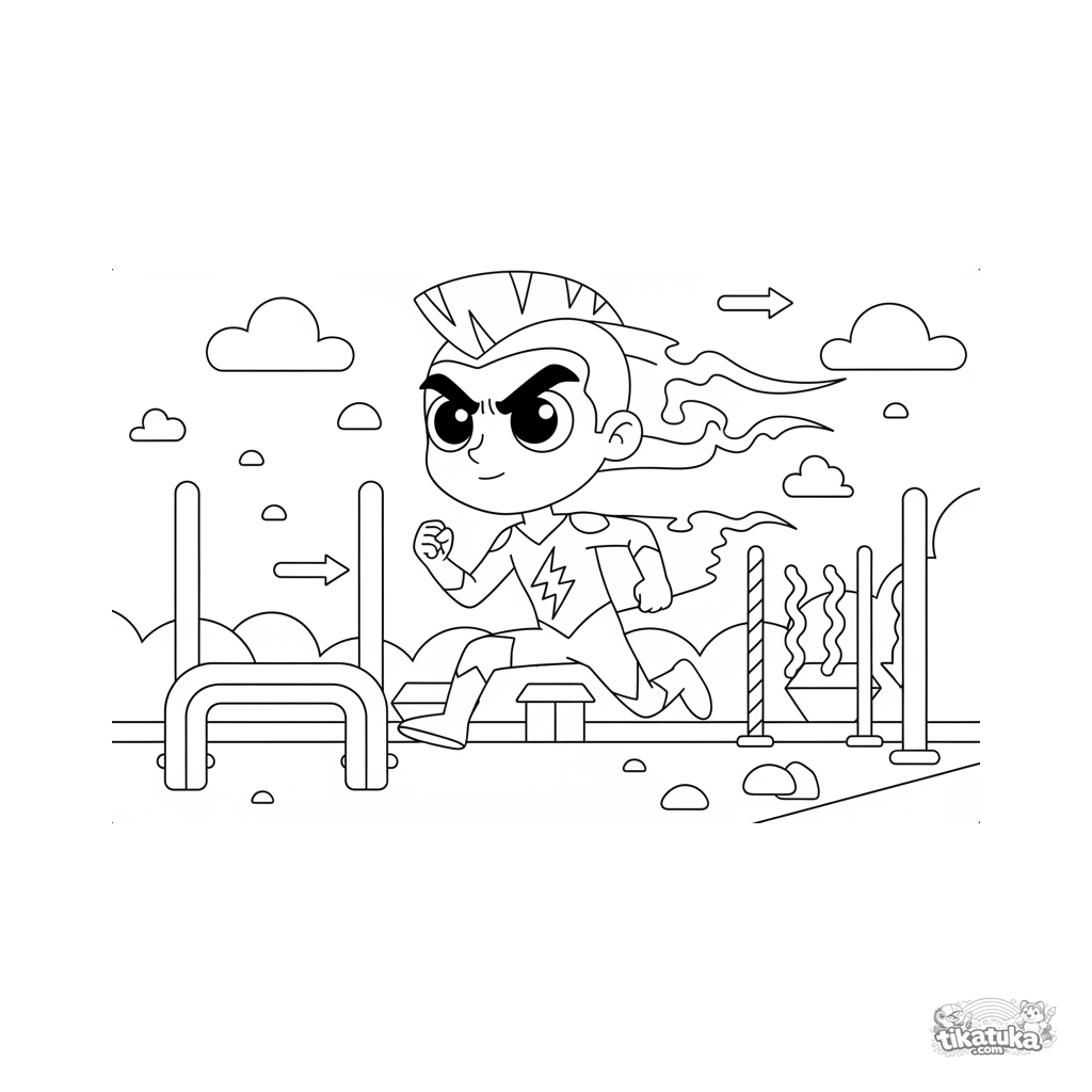 Coloring page for kids 4-6: a speed superhero as a motion blur races through a bright training obstacle course. Dynamic and fun action scene.