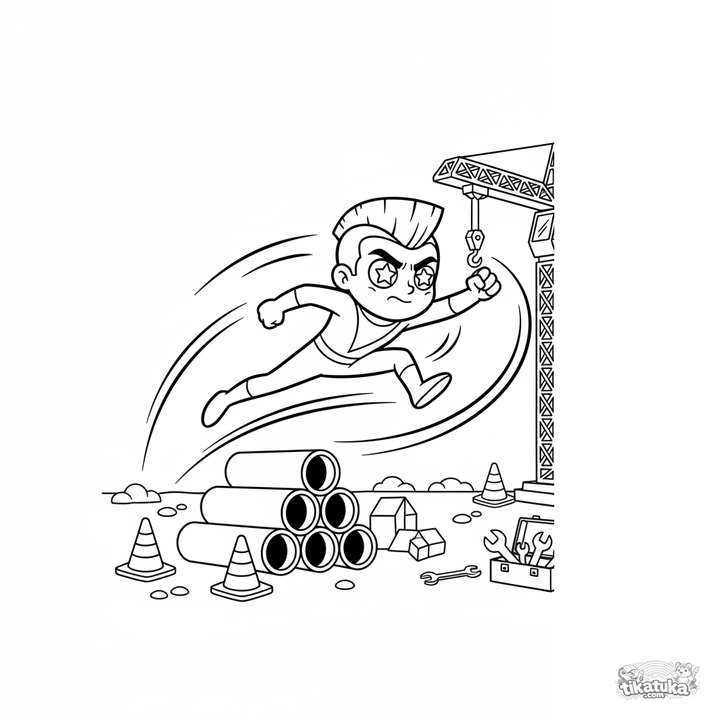 Coloring page for ages 7-9: a superhero with super speed races through a construction site, navigating obstacles of pipes and cranes. An energetic scene.