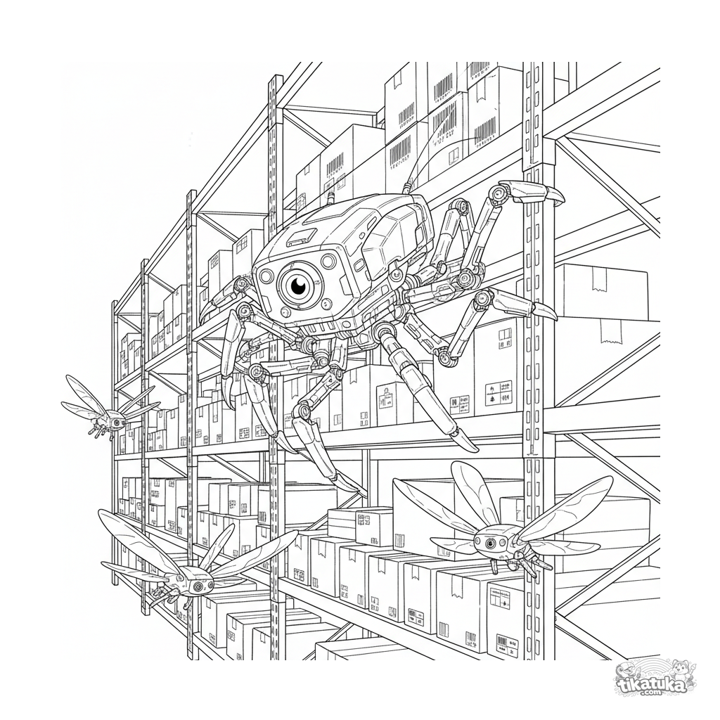 Complex technical coloring page for older kids 10-12: a multi-legged spider robot climbs ceiling-high warehouse shelves and scans barcodes on boxes, with drones flying below in the aisles.