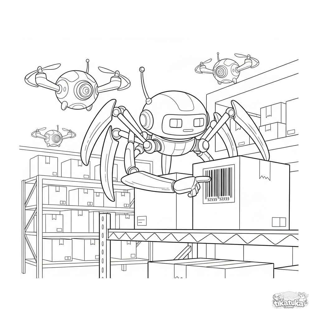 Coloring page for tweens 7-9: a multi-legged spider robot with a camera dome scans a barcode on a box on a high warehouse shelf, with hovering drones in the background. Moderate detail.
