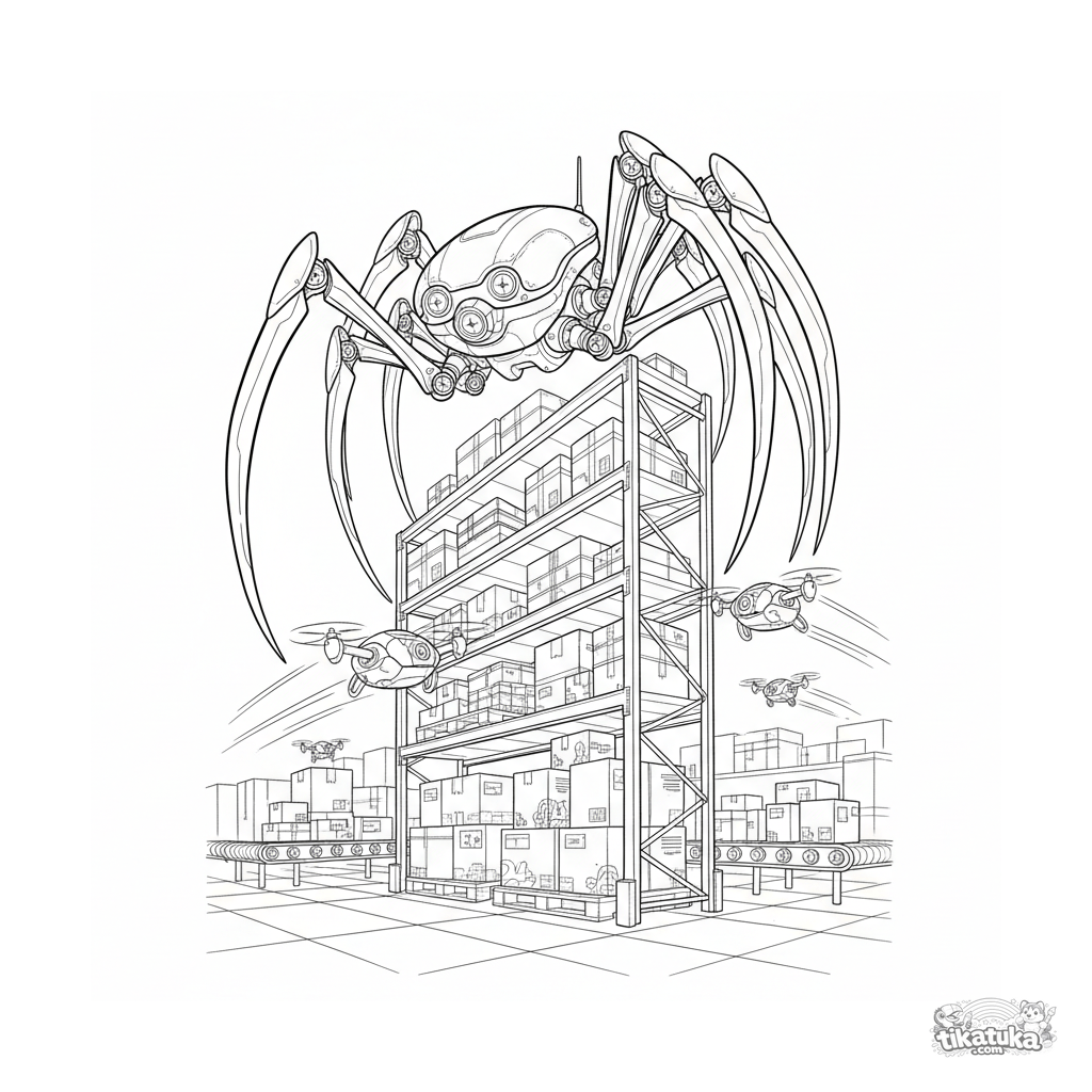 Complex coloring page in a technical style: a spider-mech on a shelf scans a warehouse with drones. For kids 10-12 years old interested in robotics and blueprints.