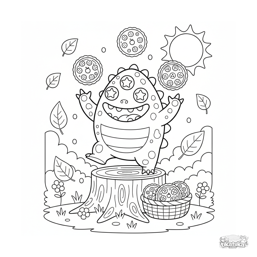 Coloring page for kids 7-9 years old: a spiky monster juggling fruit tarts in a picnic clearing. Dynamic pose, fun atmosphere.