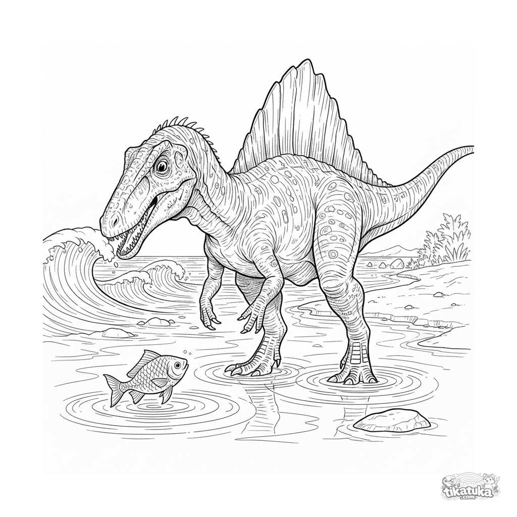 Coloring page for older kids 10-12: a spinaurus fishing in the shallows off a sandy ancient ocean coast. Detailed naturalistic illustration with sail and waves.