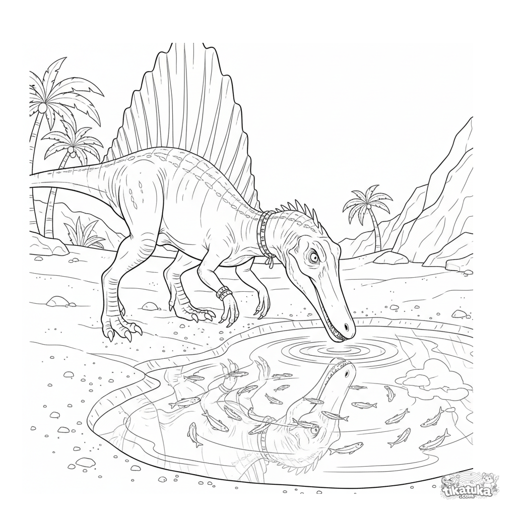 Complex coloring page for ages 10-12: a realistic spinosaurus hunts fish in a tidal pool on an ancient beach. Rich in detail and anatomical features.