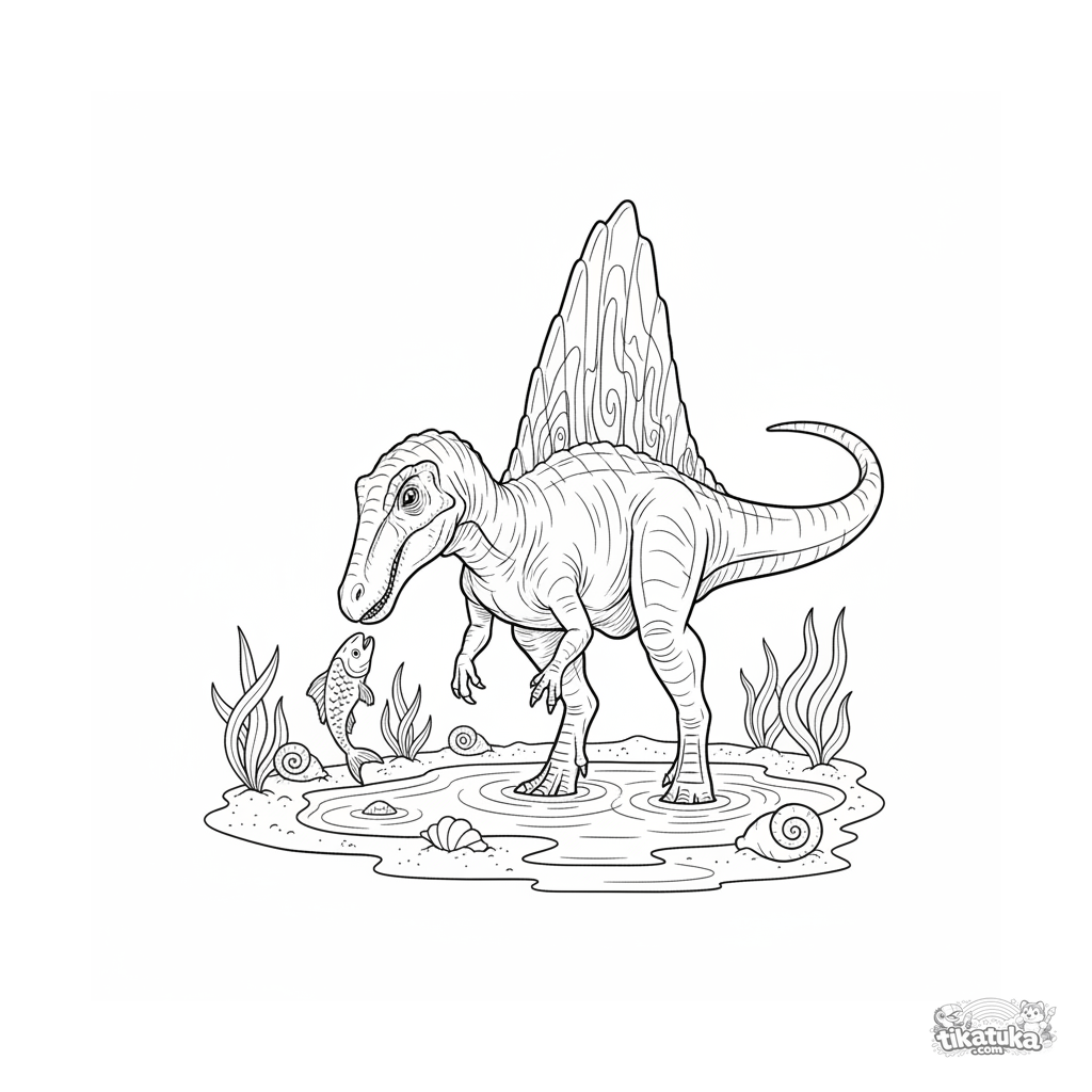 Detailed coloring page for kids 10-12: a spinosaurus fishing in a tidal pool on an ancient coast. A realistic and educational illustration.