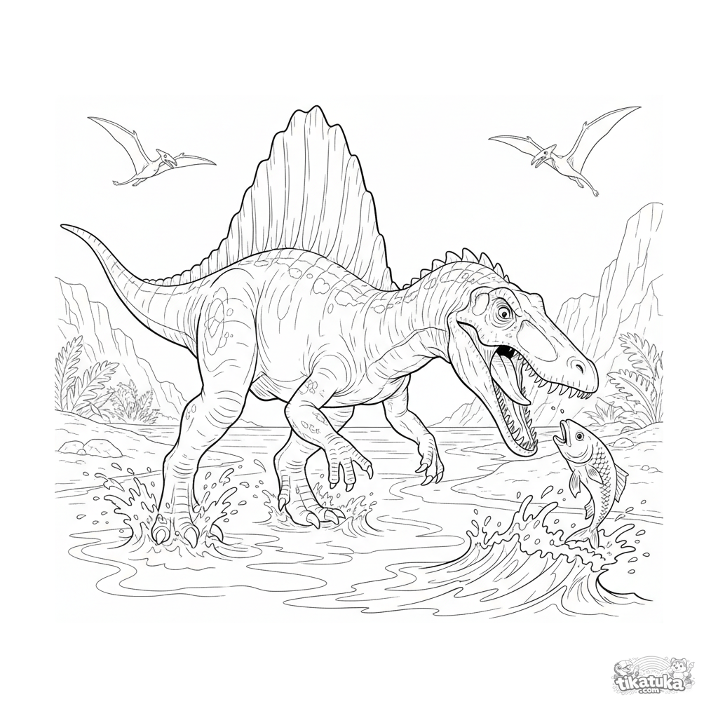 Coloring page for older kids 10-12 years: a spinaurus fishes in the shallows off an ancient ocean sandy beach. High detail level, anatomically accurate forms.