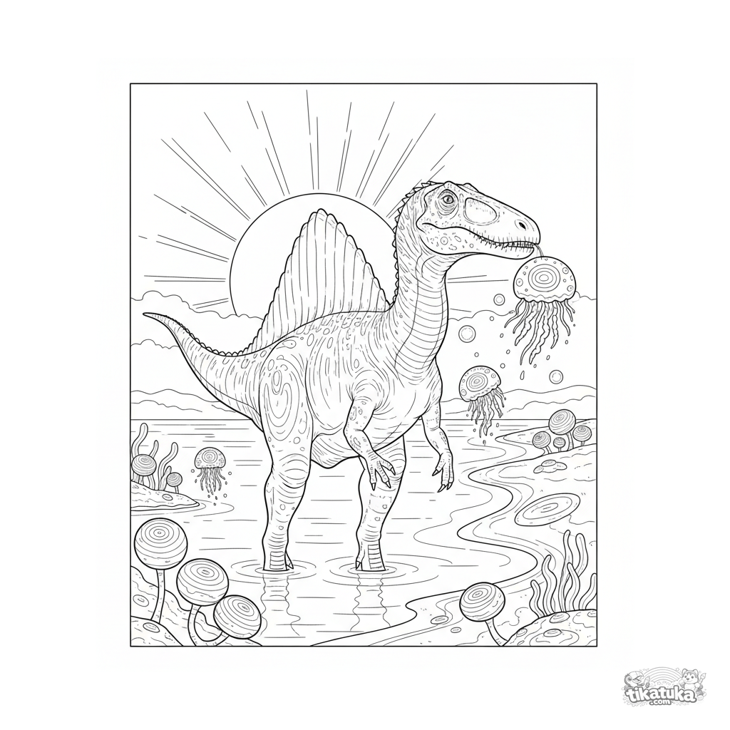 Complex coloring page for ages 10-12: a spinosaurus wades in the twilight, catching glowing jellyfish in the waters of an ancient ocean. Detailed anatomy and atmospheric scene.