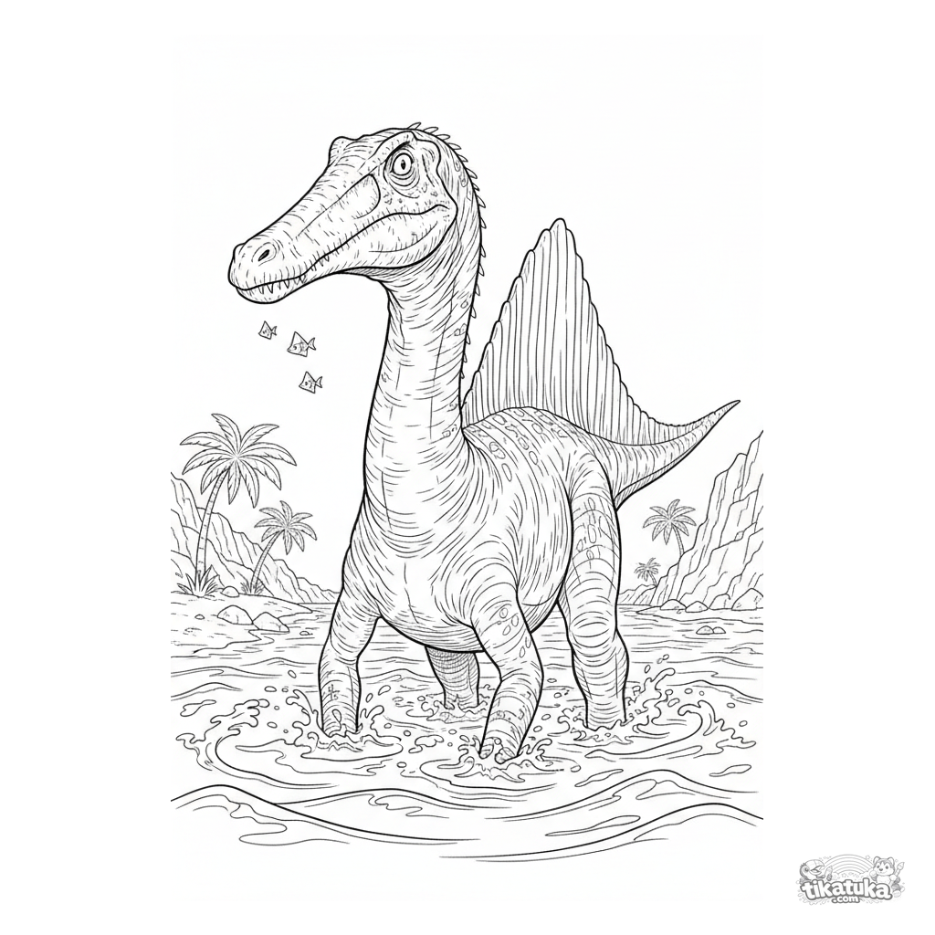 Complex coloring page for ages 10-12: a spinaurus wades into the surf of an ancient ocean to hunt for fish. Detailed, realistic depiction with waves.