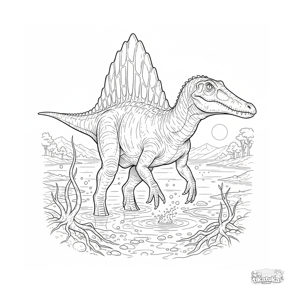 Complex vintage-style coloring page for kids 10-12: a spinaurus wades carefully through the water of a coastal lagoon on an ancient beach. Detailed engraving style.