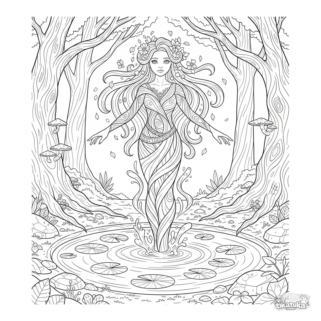 Coloring page for older kids 10-12: a spirit of the spring, woven from water and vines, rises from a forest pool. Art Nouveau style with flowing lines.