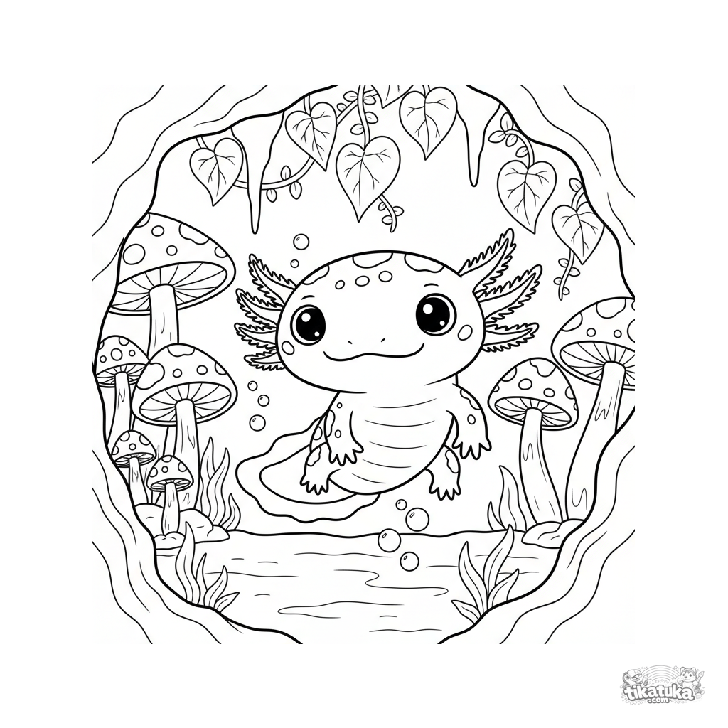 Coloring page of a friendly spotted axolotl swimming in a magical underwater grotto among glowing mushrooms. Perfect for kids aged 4-6 to spark creativity.