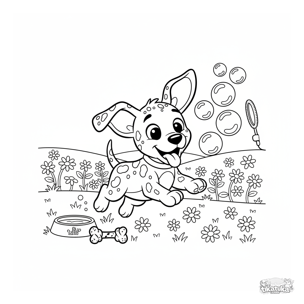 Coloring page for kids 3-6: a playful dalmatian puppy chases bubbles in a sunny meadow. Simple details for easy coloring fun.