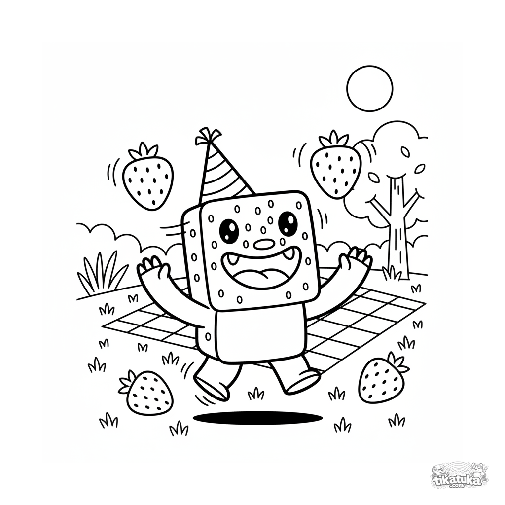 Coloring page for kids 4-6 years: a cheerful square monster juggling strawberries in a picnic clearing. A bright, dynamic scene perfect for coloring.