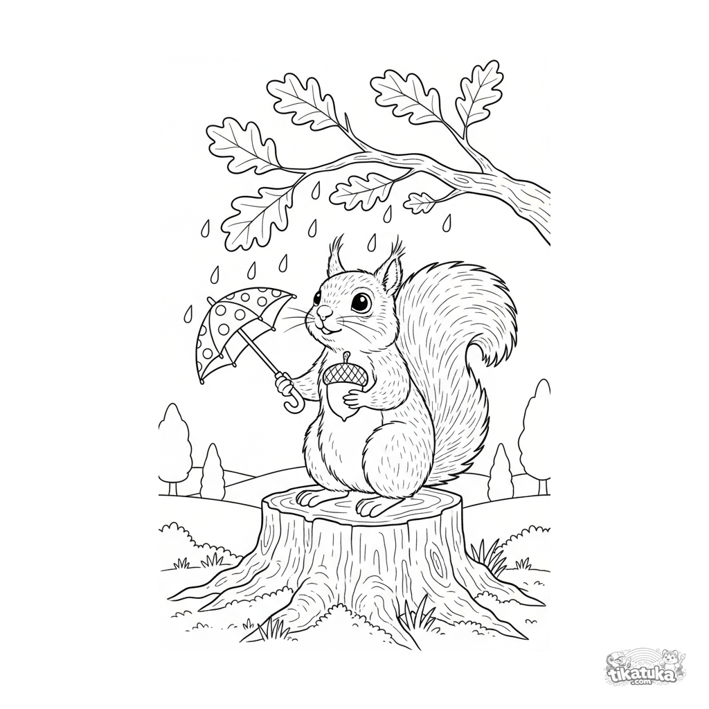 Coloring page for kids 4-6 years: a fluffy squirrel on a stump holds an umbrella and an acorn under the autumn rain in the forest. Moderate detail, clear outlines.