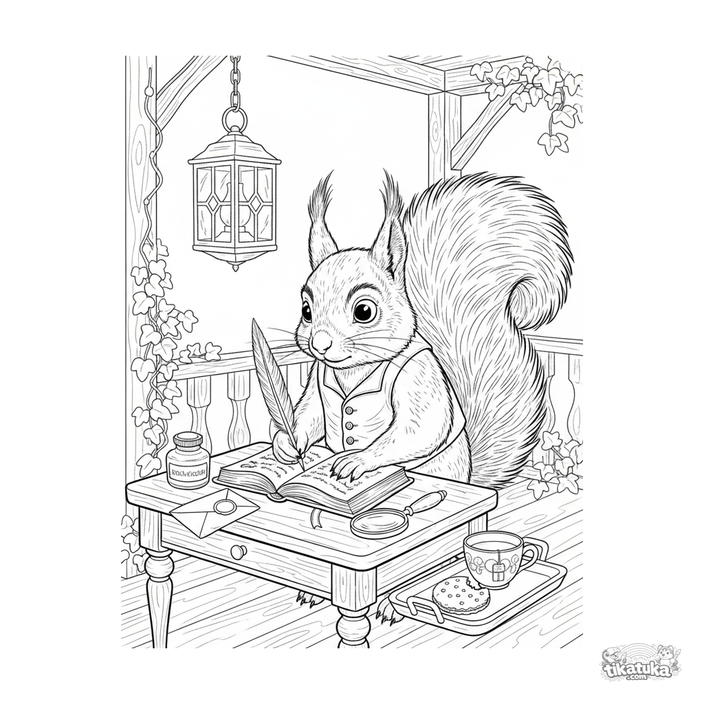 Detailed coloring page for older kids 10-12: a scholarly squirrel journals at an antique desk on a veranda. Intricate line work, textures, many accessories, rich background.
