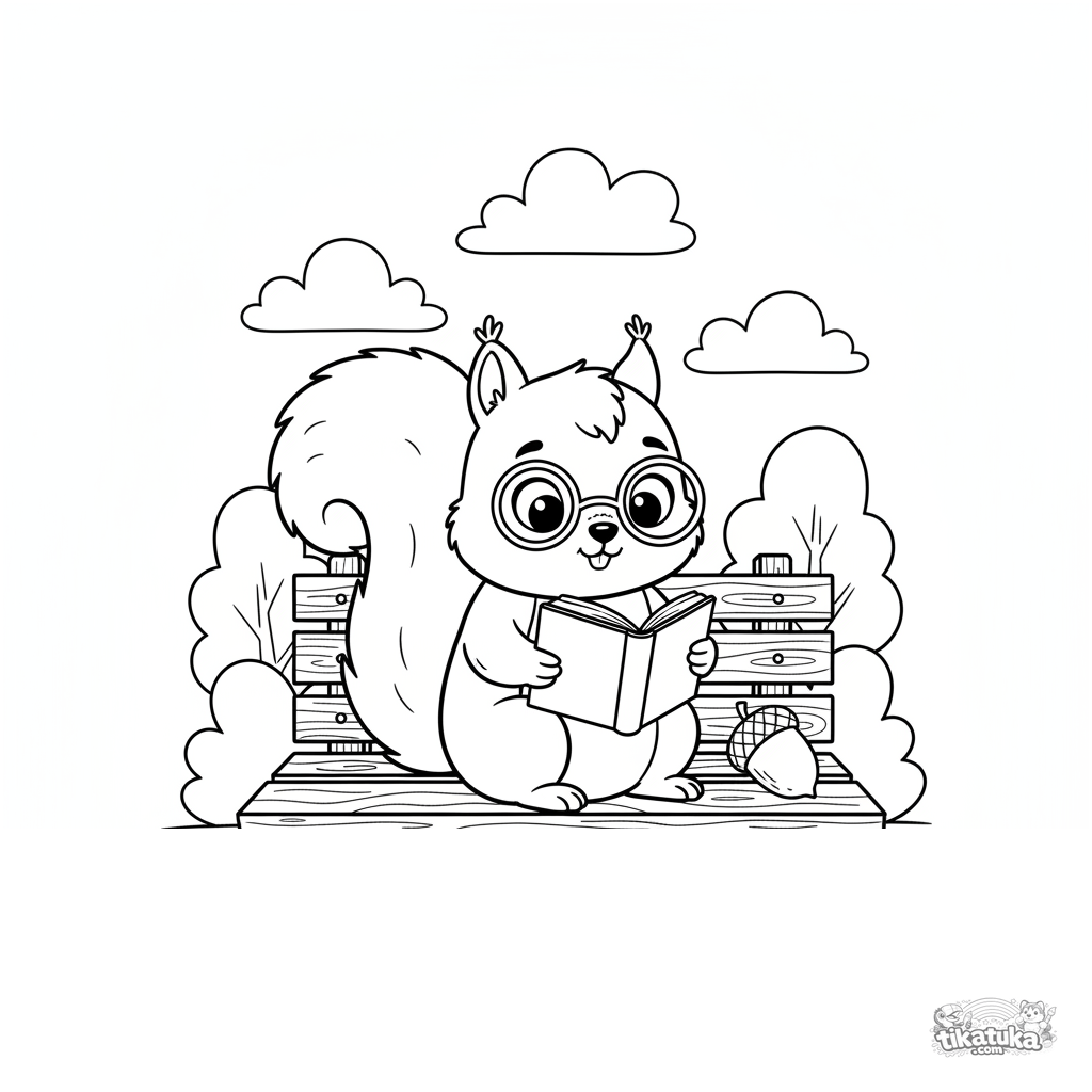 Coloring page for kids 7-9: a squirrel wearing spectacles reads a book intently while sitting on a bench in a city park. A cute autumn scene.