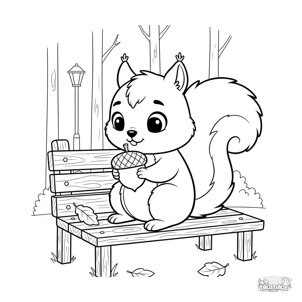Coloring page for kids 4-6: a squirrel sits on a city park bench examining an acorn, with autumn leaves scattered around.