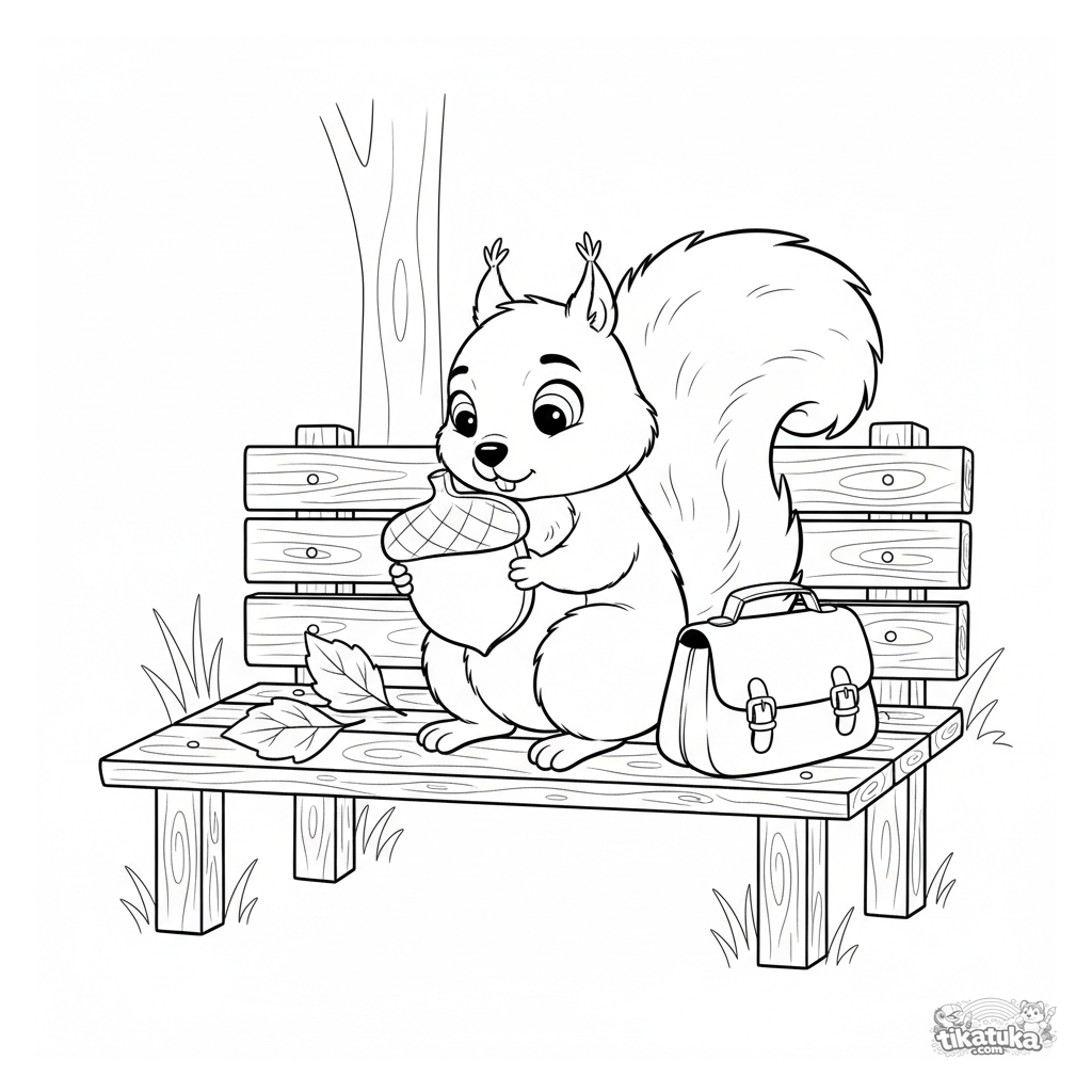 Coloring page for kids 7-9: a squirrel sitting on a city park bench, figuring out a wooden acorn-shaped puzzle. Autumn leaves around.