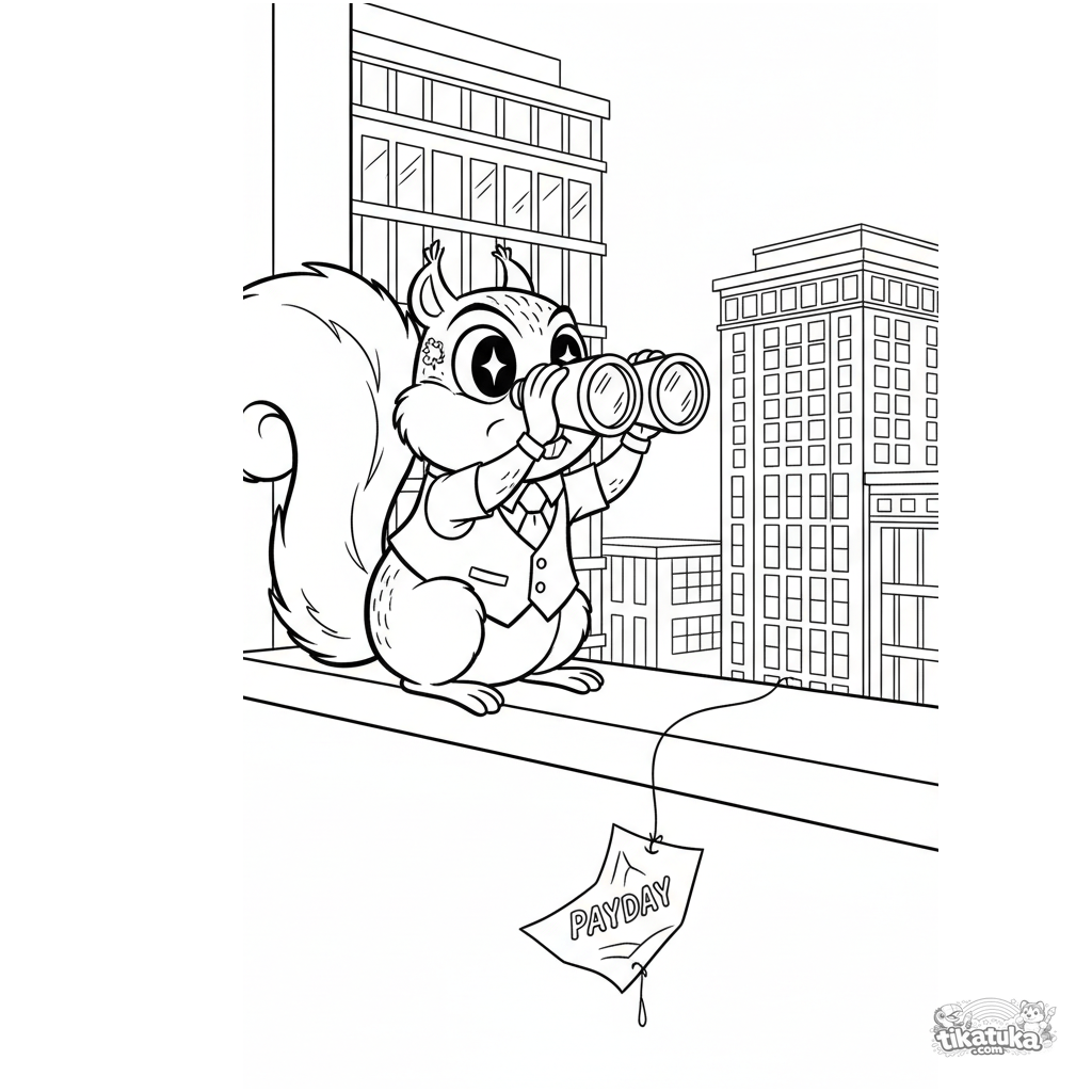 Coloring page for kids 10-12: a squirrel in an office vest with binoculars looks for payday from a high ledge. Funny internet scene with details.