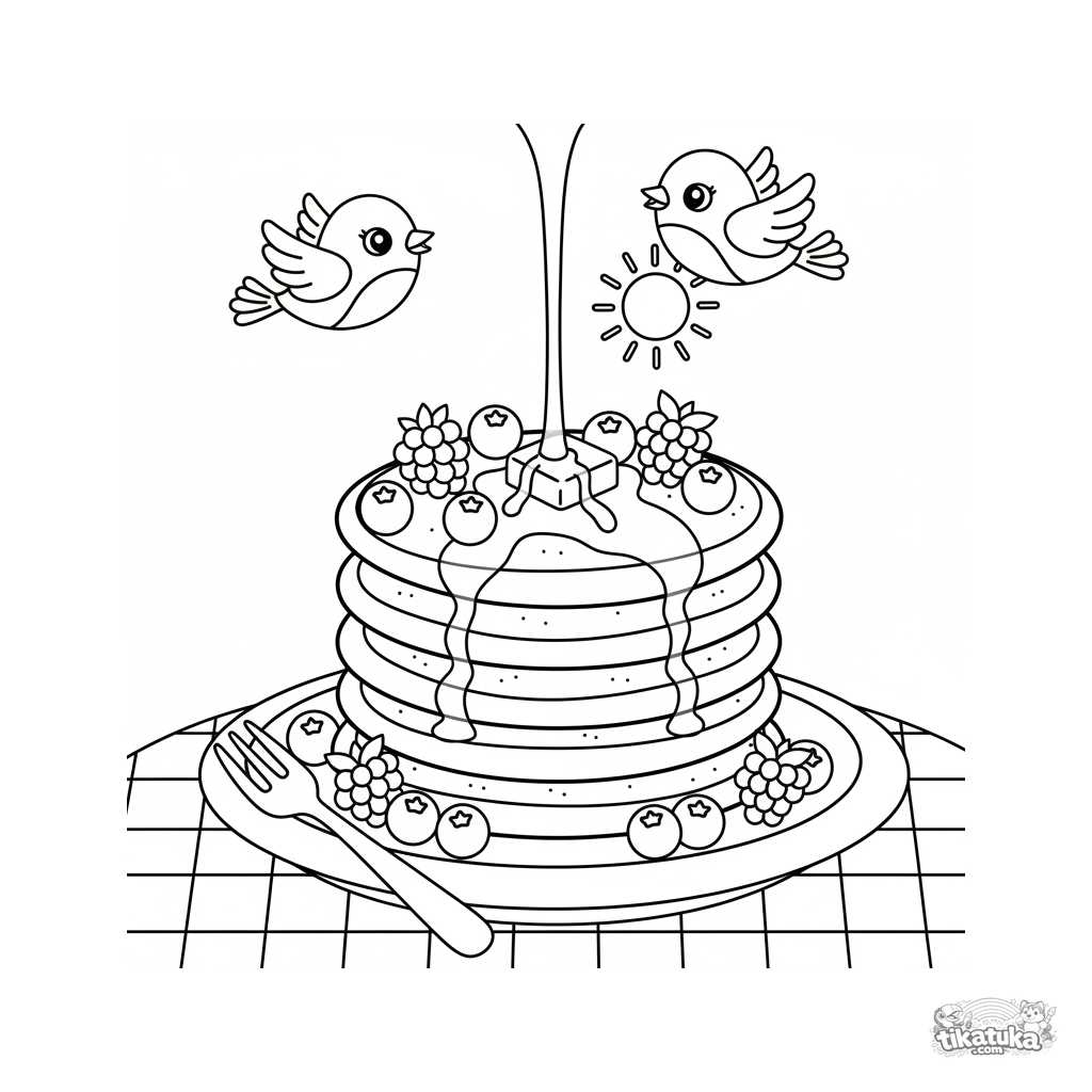 Coloring page of an appetizing stack of pancakes with berries and syrup. For kids 4-6 years old. A simple and fun food scene.