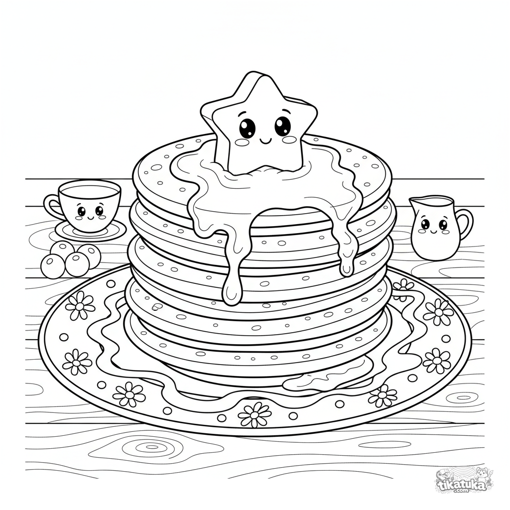 Coloring page for kids 4-6. A delicious stack of pancakes with yummy topping on a plate. A fun and simple food scene to color.