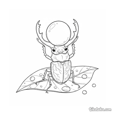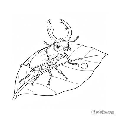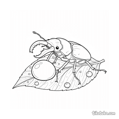 Coloring page for kids 4-6: a mighty stag beetle displays its large mandibles while standing on a leaf with dewdrops. A bold insect character.