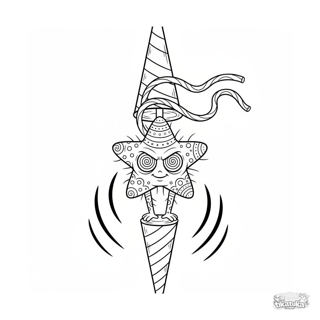 Detailed coloring page for older kids 10-12: a star microbe gymnast performs a handstand on the tip of a lollipop. Dynamic comic style, action lines, intricate detail.