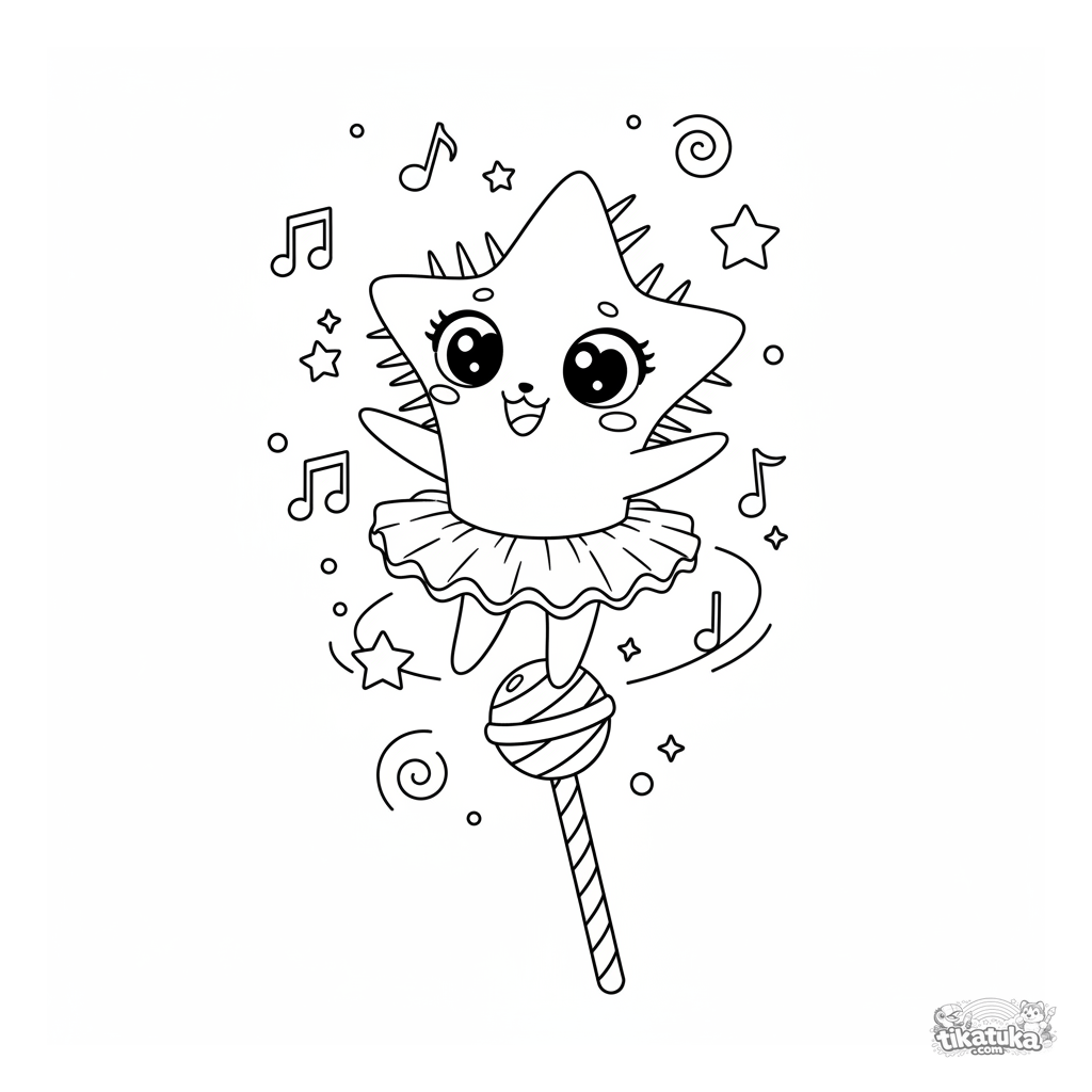 Coloring page for kids 7-9: a star-shaped microbe in a tutu dances on the tip of a lollipop. Light, graceful scene with music notes and sparkles.