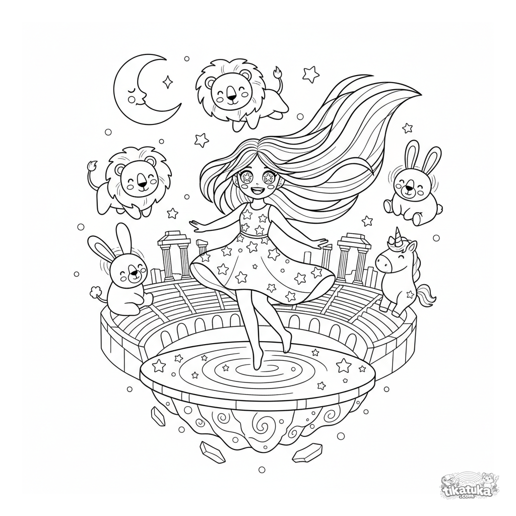 Coloring page for kids 5-9: a joyful star nymph dances in the night sky above an ancient amphitheater. Magical constellations and light, airy forms for coloring.