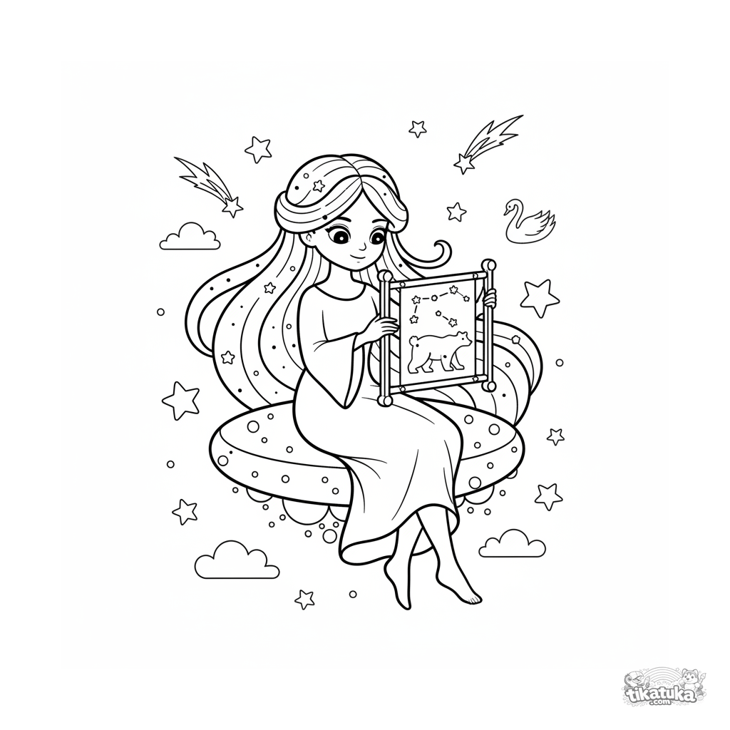 Coloring page for tweens 7-9: a graceful star nymph sitting on a floating platform, weaving a glowing net from strands of starlight to form constellation shapes.