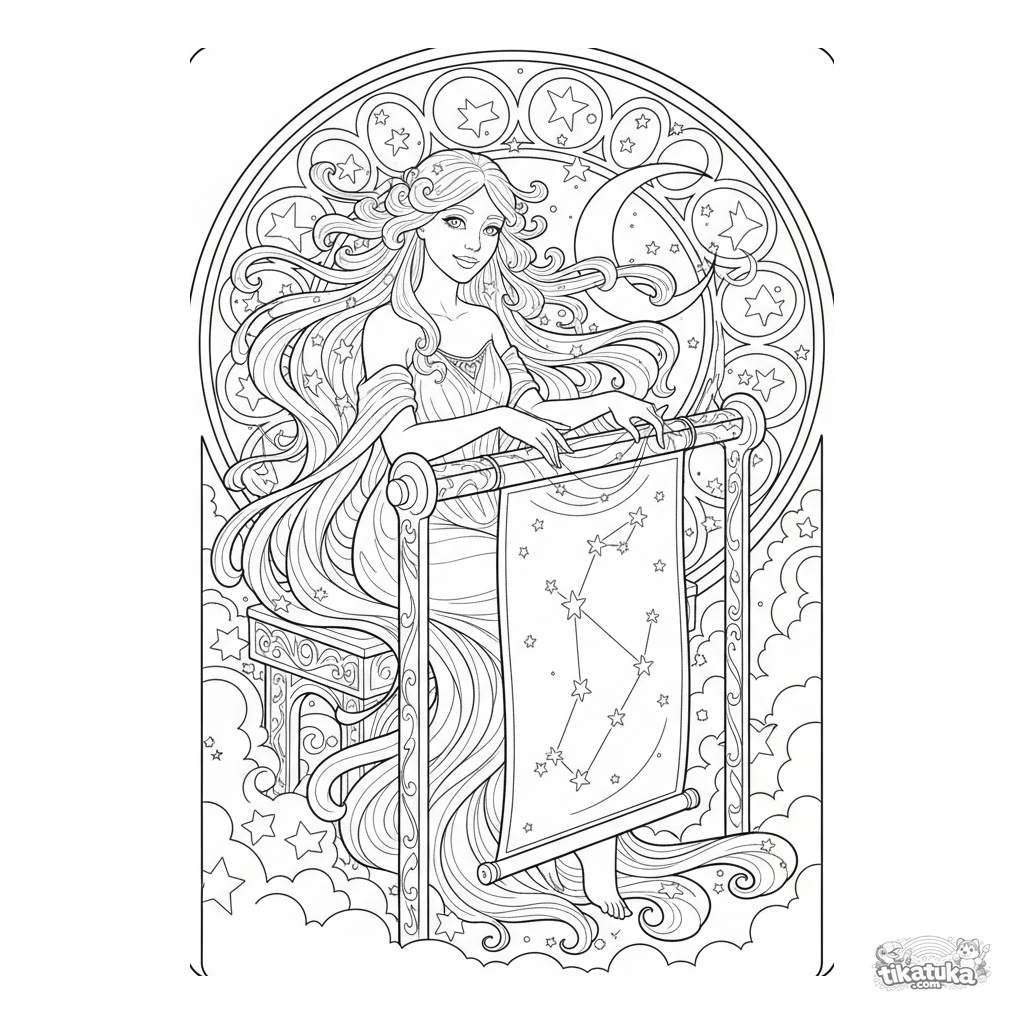 Coloring page for older kids 10-12: a celestial star nymph with stardust hair weaves a luminous tapestry of a new constellation against the night sky. A detailed and beautiful fantasy scene.