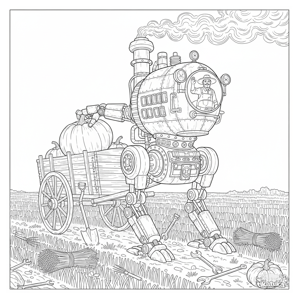Intricate realistic coloring page: a steam-powered farm robot harvesting a giant pumpkin in a field. For kids aged 8-12. Details include riveted plates, a glass cockpit, and a wooden cart.
