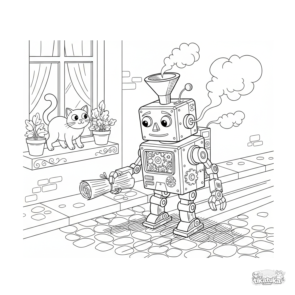 Hard coloring page in a realistic style: a steam-powered robot delivers a newspaper on a vintage street. For ages 7-12, with detailed mechanics and background.