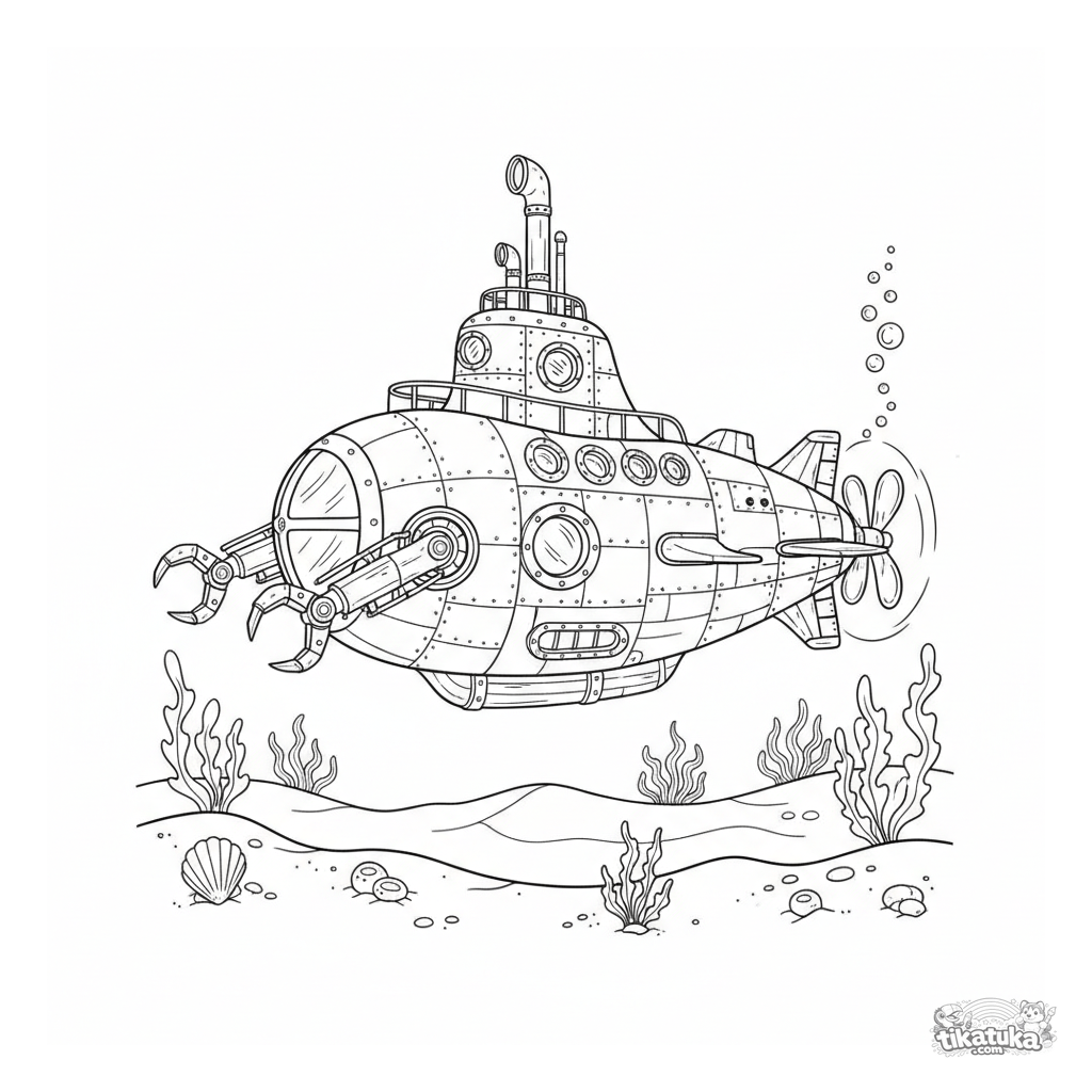 Hard, realistic coloring page of a steam-powered submarine in the ocean. For kids aged 8-12. Detailed hull, portholes, and mechanical arms.