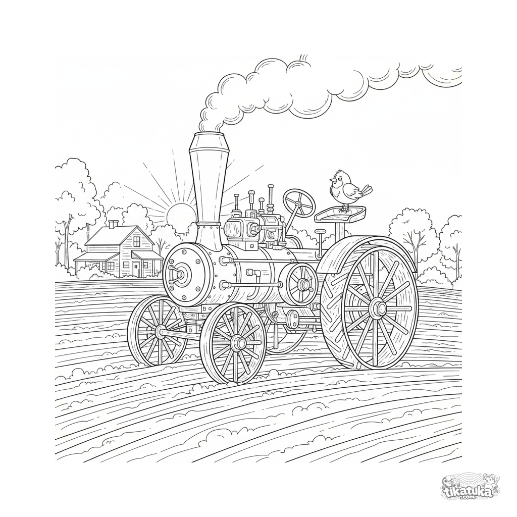 Hard, realistic coloring page for kids aged 8-12: a detailed steam-powered tractor with wooden wheels plows a field at dawn. Lots of mechanical details.