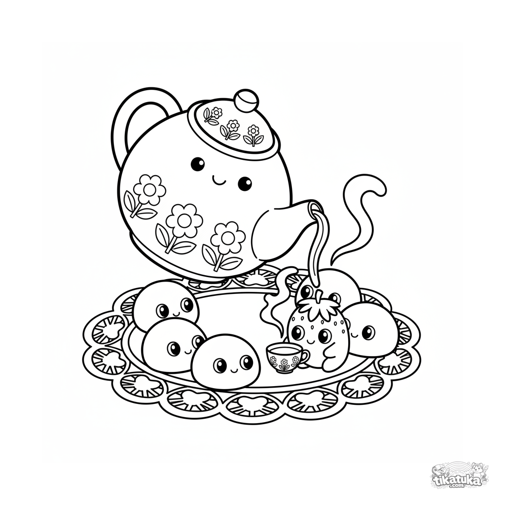 Simple coloring page for toddlers 2-3: a teapot pours tea for strawberry mochi guests. Large clear shapes, few details.
