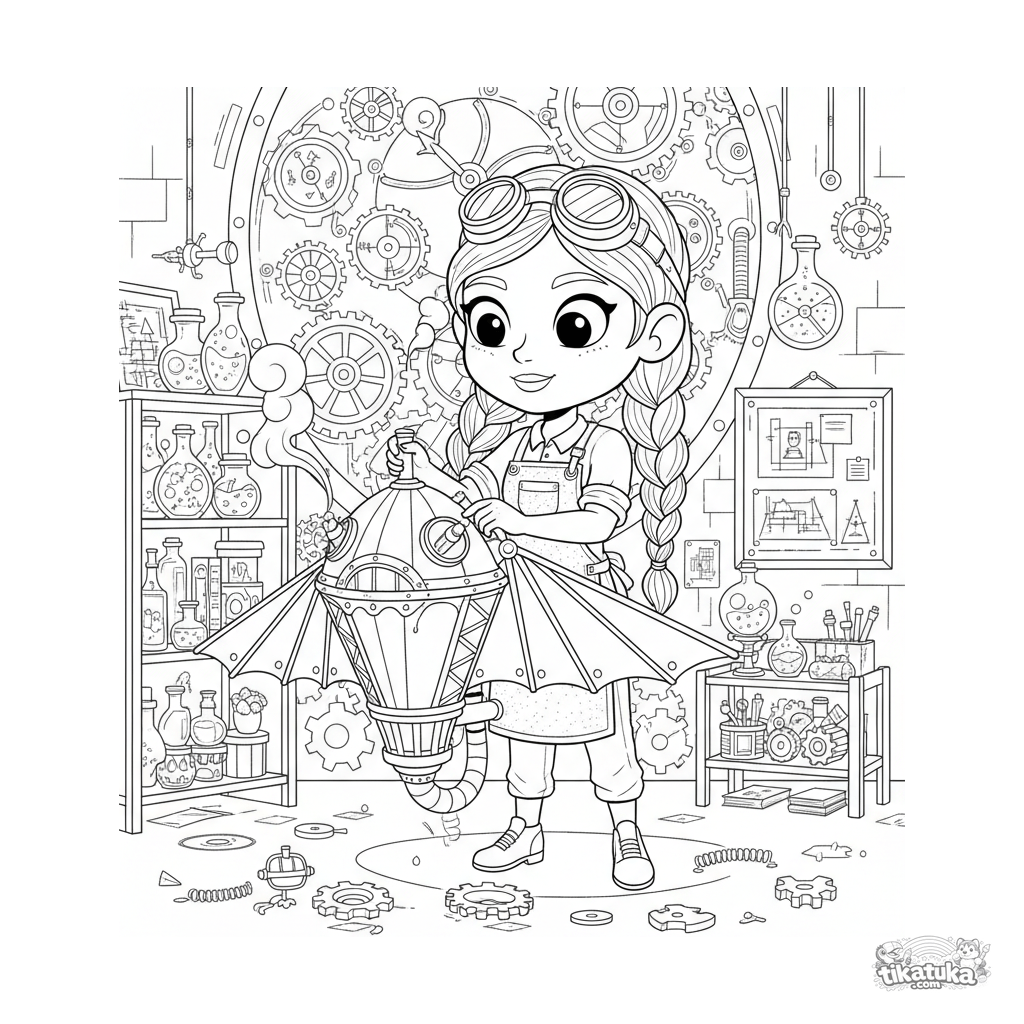 Detailed steampunk anime coloring page: an inventor girl adjusts a flight device in her clocktower workshop. An intricate scene with gears, blueprints, and tools for ages 10-12.