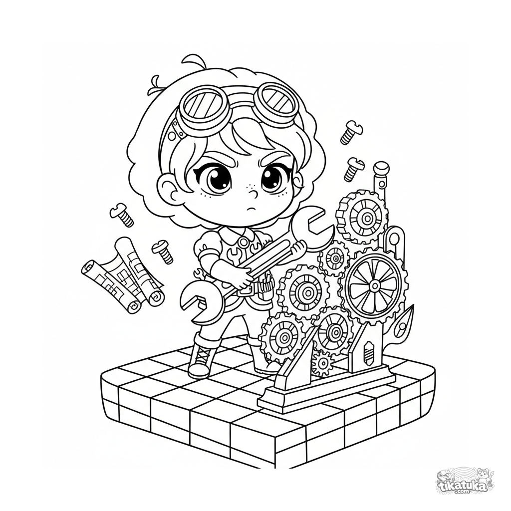 Complex coloring page for older kids 10-12: a steampunk princess in a cloud workshop repairs a flying machine. Lots of gears, tools, and details.