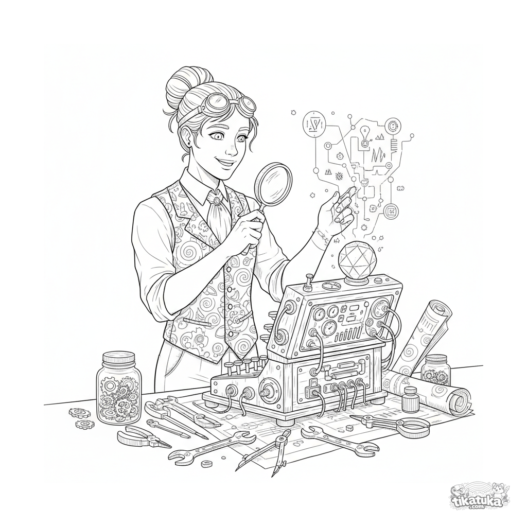 Coloring page for kids 10-12: a steampunk tinkerer in a basement crafting a fantastical brass-and-wood cyber deck. Details: blueprints, gears, hologram. Vintage engraving style.