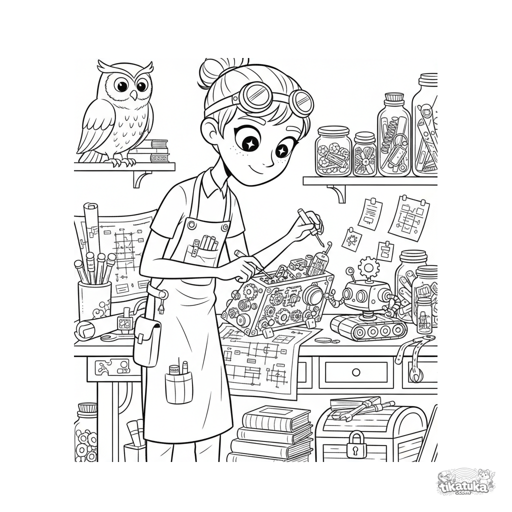 Fantasy coloring page: a steampunk inventor assembling a brass cyberdeck in a basement lab. Lots of details: gears, tubes, tools. For ages 10-12.
