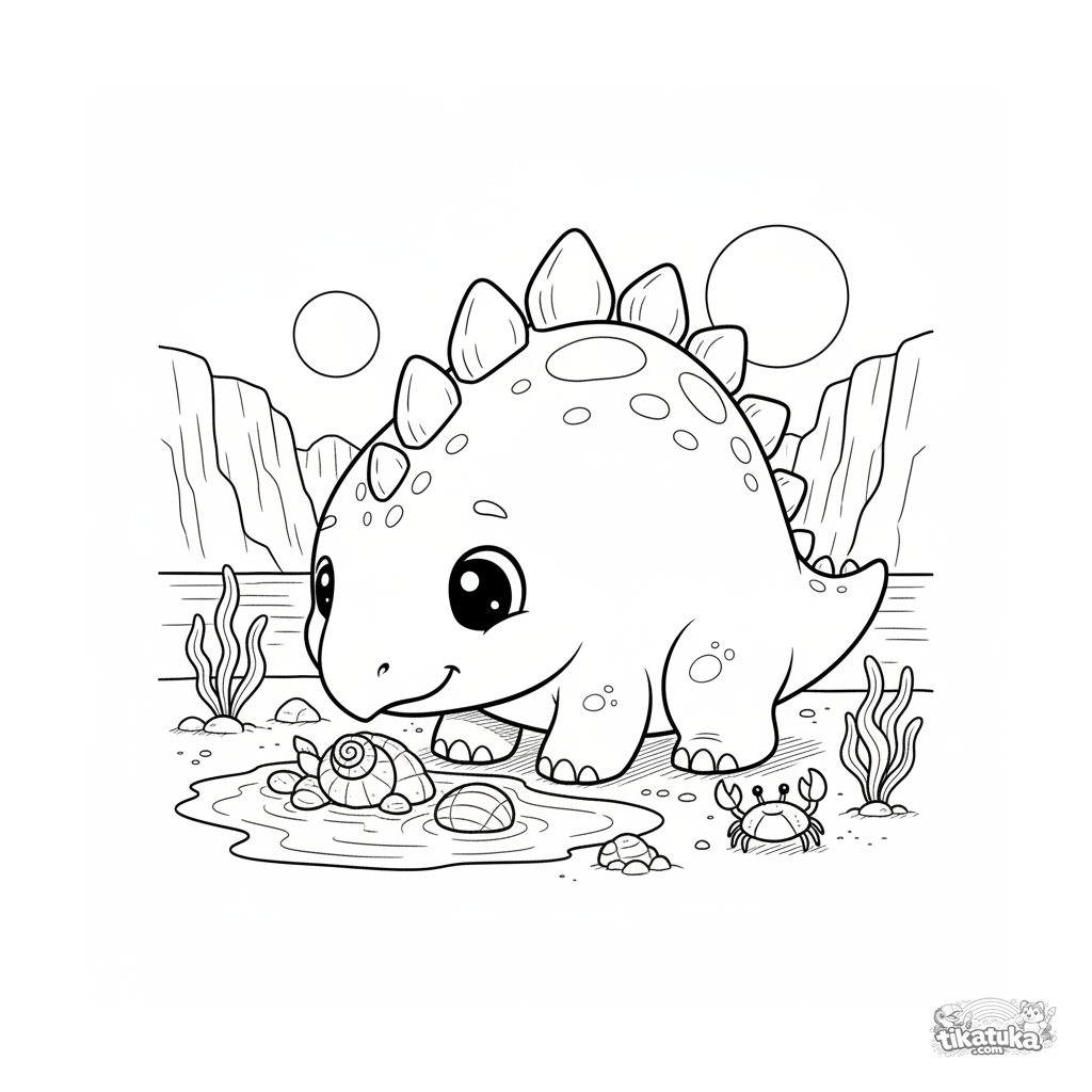 Coloring page for kids 4-6: a stegosaurus collecting seashells in a shallow tide pool on an ancient ocean beach. Balanced detail with clear shapes.
