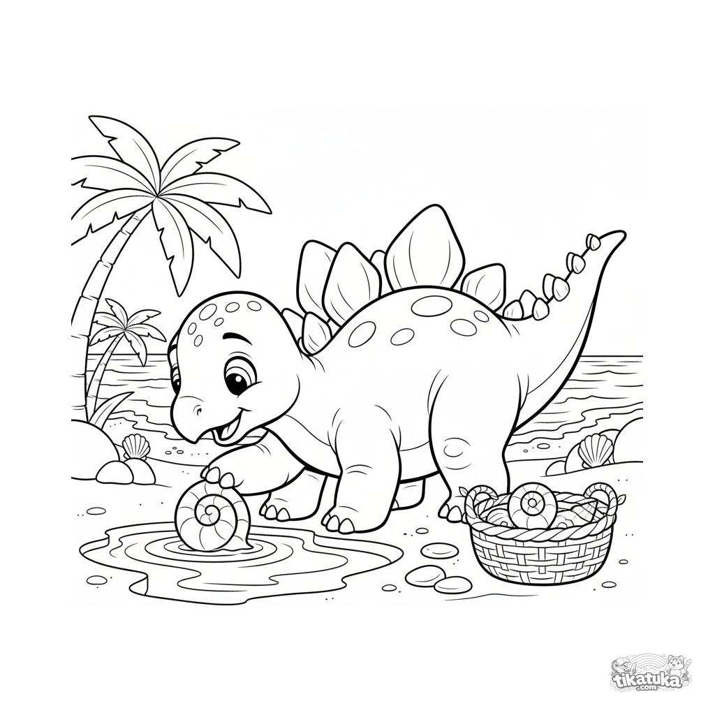 Coloring page for ages 7-9: a young stegosaurus curiously collects seashells in a tide pool on an ancient beach. A dynamic and detailed scene for coloring.