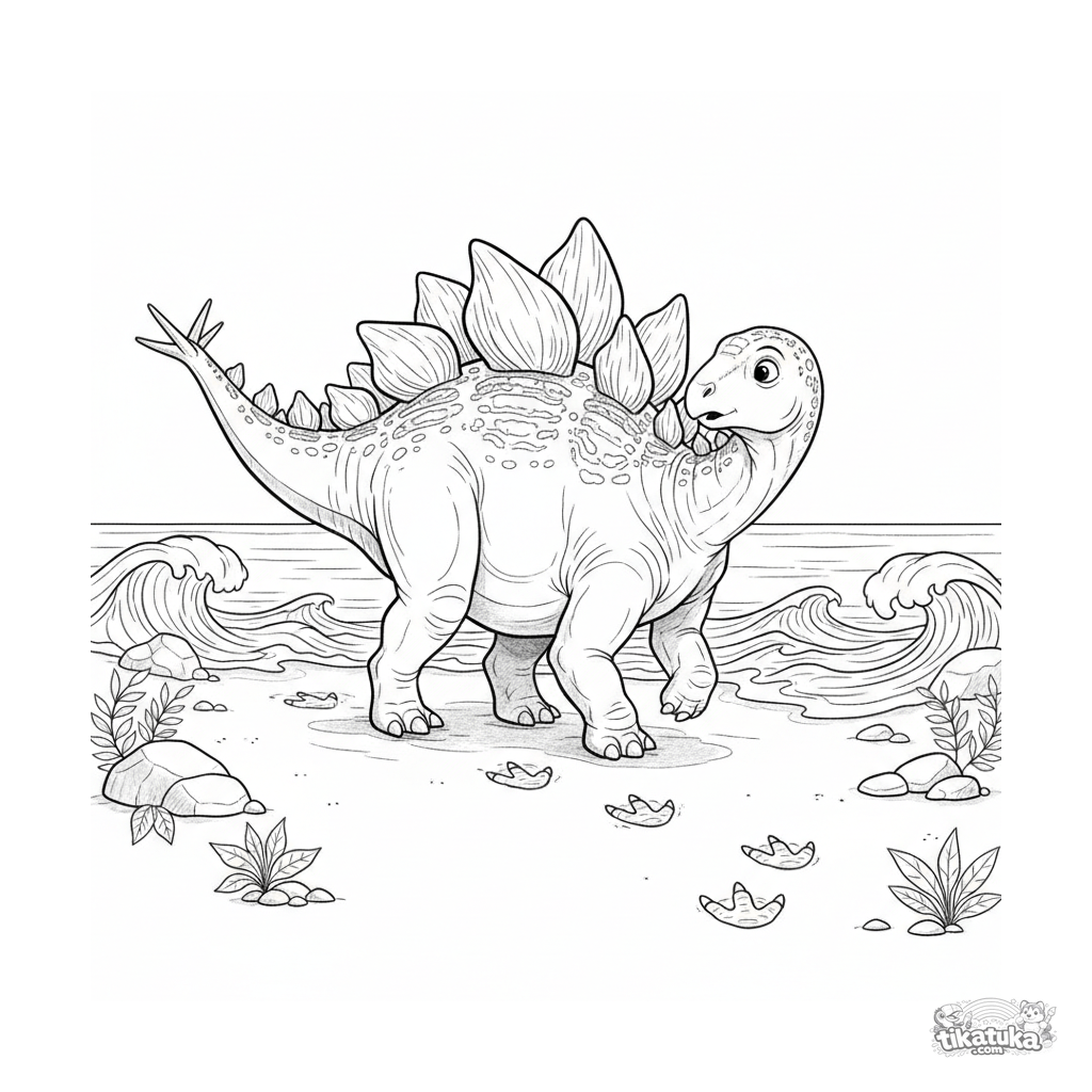 Detailed watercolor-sketch style coloring page for kids 10-12: a stegosaurus leaving footprints in the wet sand of an ancient ocean.