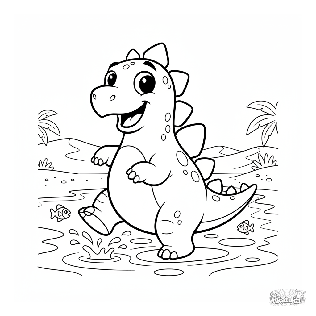 Coloring page for tweens 7-9: a cheerful stegosaurus splashing in the shallow water of an ancient ocean. A dynamic and fun scene in a cartoon style.